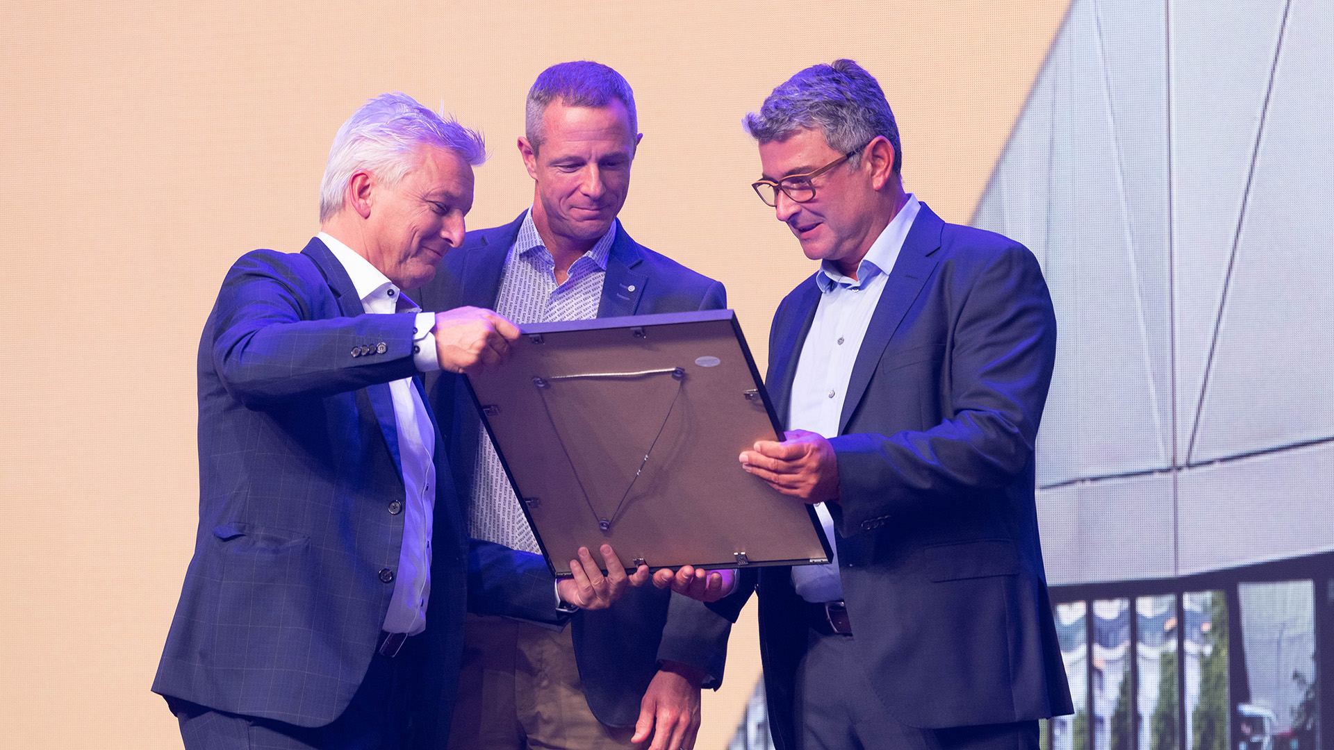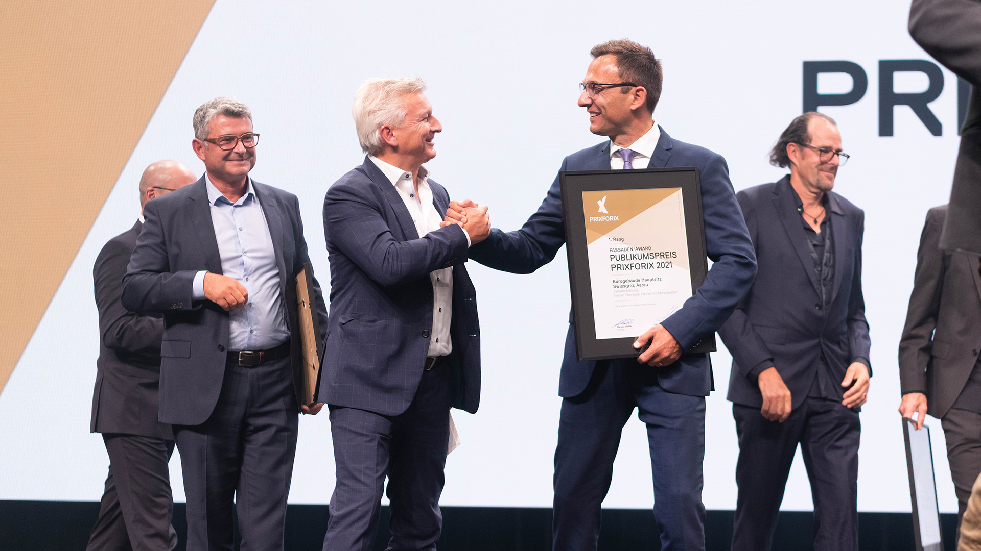 Für Aepli-CEO Matthias Elmer ging es vor der Verleihung des Jury-Preises noch auf die Bühne: Zusammen mit den beiden PRIXFORIX-Jurymitgliedern Erika Fries und Reto Gloor sprach er über «Die Zukunft der Fassade». Zudem übergab Roman Aepli den zweiten Publikumspreis den glücklichen Gewinnern.