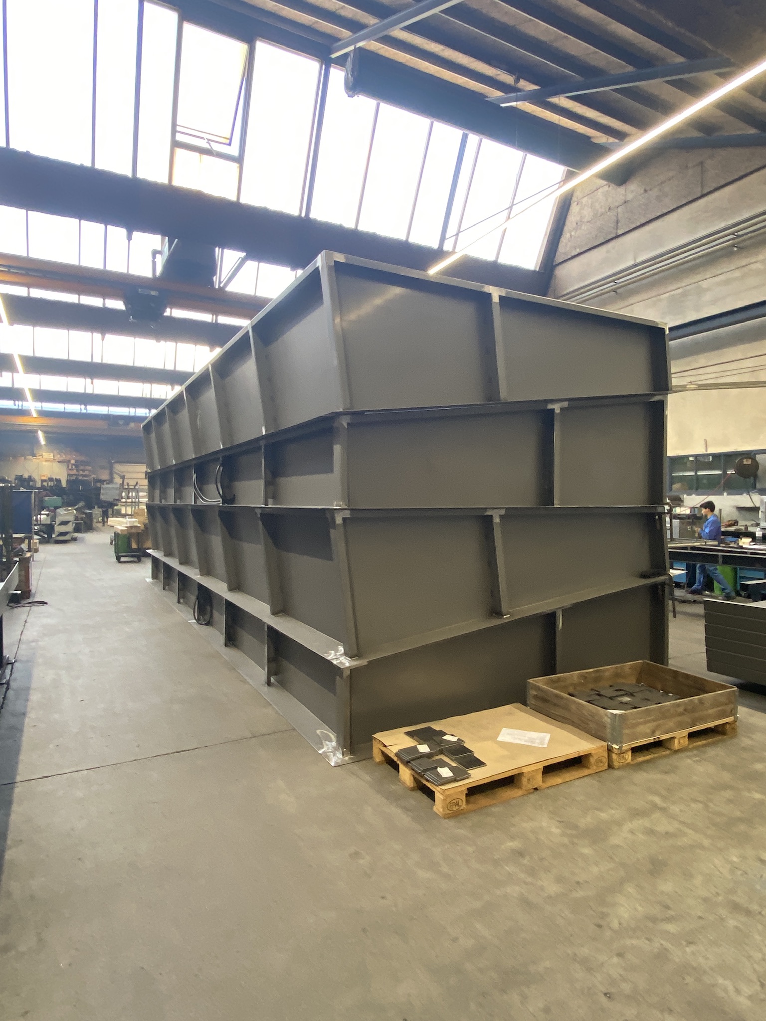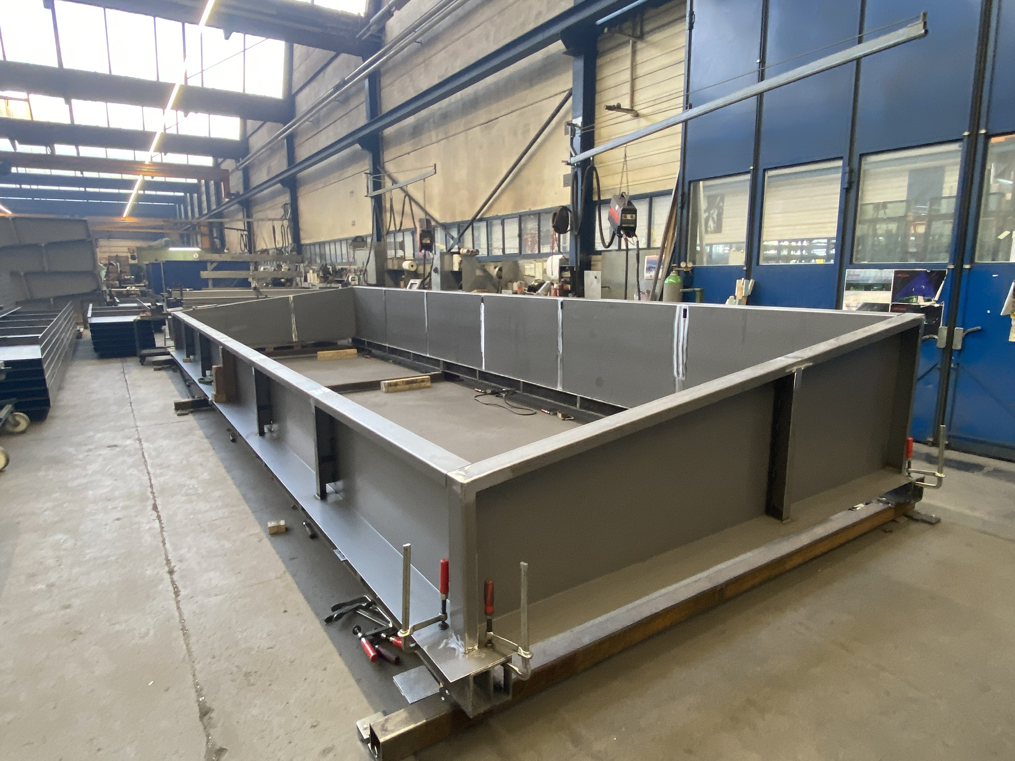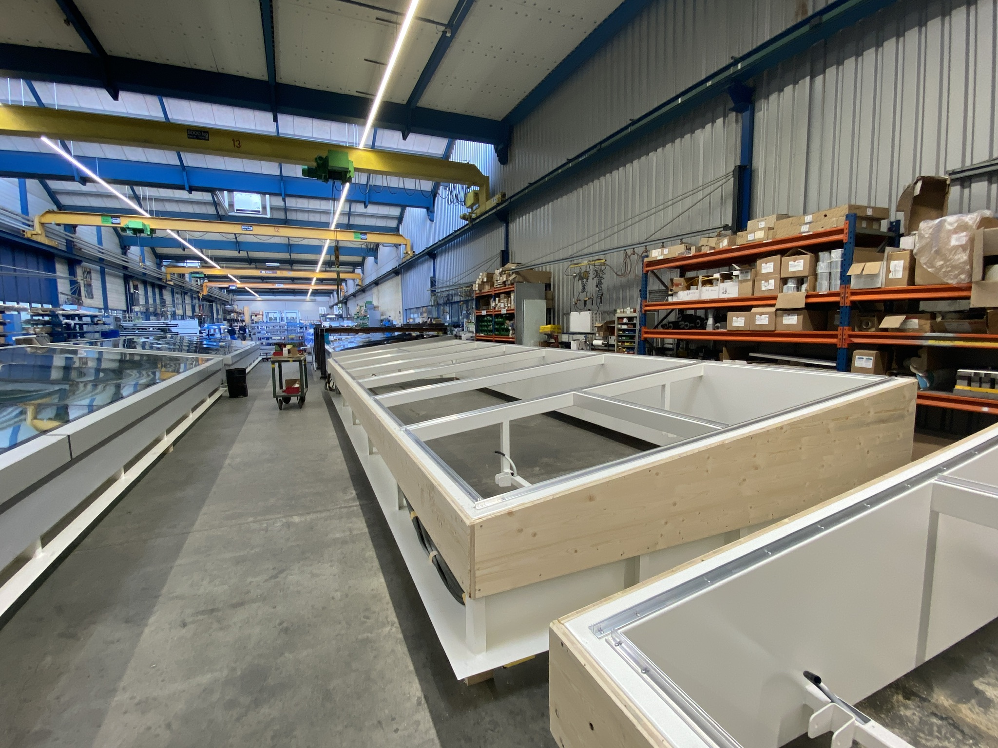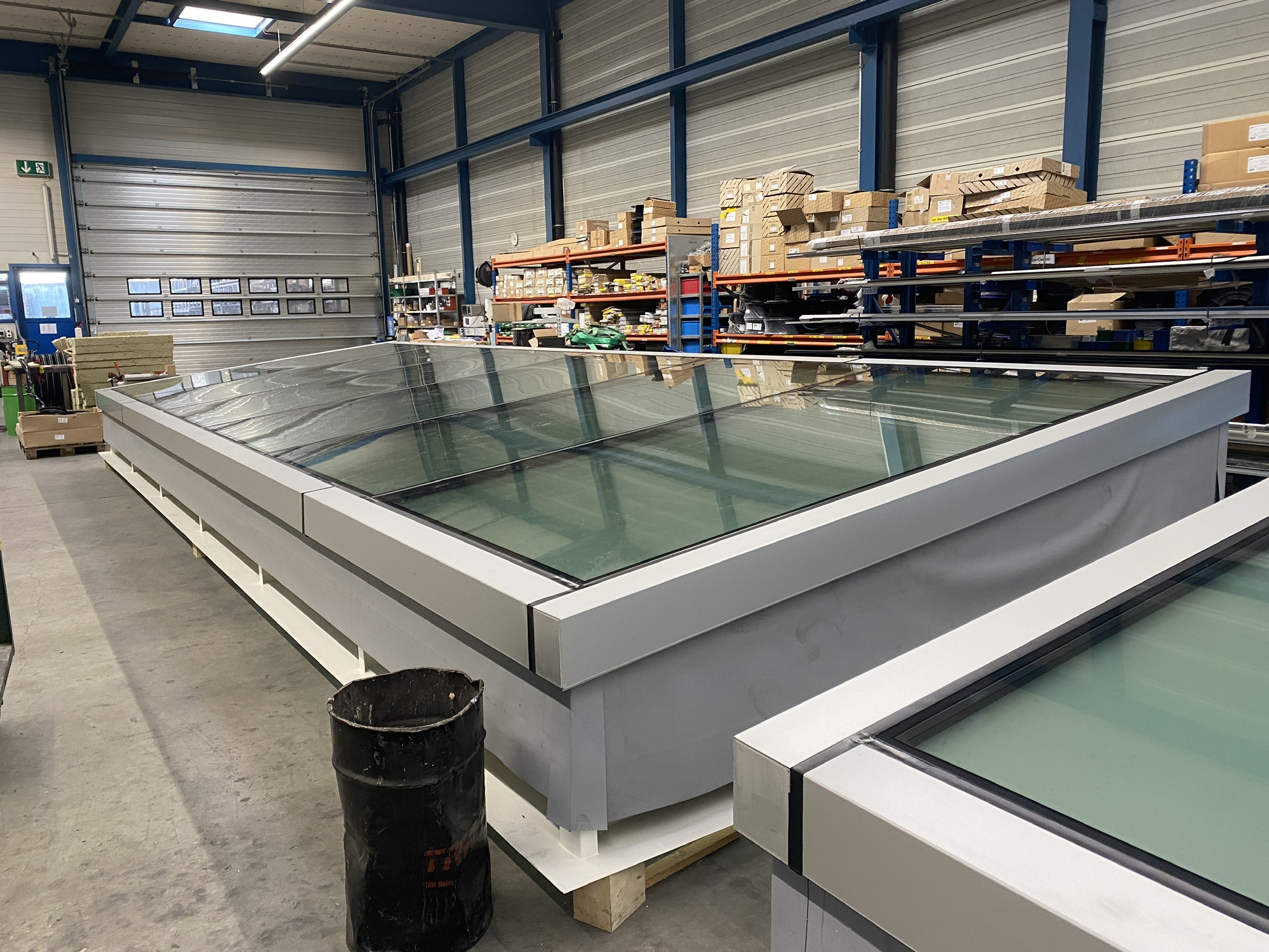 Während auf unserem neuen Firmengelände die Arbeiten rasch vorangehen, sind auch die Dachoblichter bereits in der Produktion. Die Unterkonstruktion der Oblichter besteht aus 3-mm-Stahlblech, welches im Blechcenter gelasert und abgekantet wird. Der Zusammenbau der Zargen erfolgt in der Schlosserei. Da die Dachoblichter sehr grosse Abmasse haben, nehmen sie einen grossen Teil unserer doch auch grossen Halle in Anspruch. Nach dem Zusammenschweissen werden die Zargen bei der Firma Aepli Stahlbau AG beschichtet. Anschliessend erfolgt das Komplettieren in der Abteilung Fenster und Türen. Die Oblichter werden in unserem Werk fixfertig komplettiert, sodass sie auf unserem neuen Firmengelände nur noch auf die Stahlträger gehoben und befestigt werden müssen. Der hohe Vorfertigungsgrad ermöglicht eine schnelle Montage und eine gleichbleibende Qualität bei der Verarbeitung der Baustoffe bei immer gleichen Raumbedingungen.