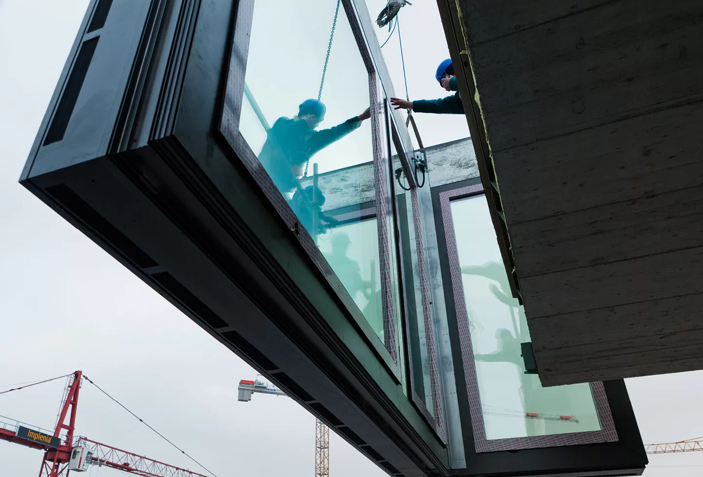 Mitten in Zürich entsteht ein neuer Stadtteil. Die Europaallee verbindet den Kreis 1 mit der Bahnhofstrasse und die Kreise 4 und 5. Die Fassadenelemente in XXL-Grösse (5.5 x 3.5 Meter) wurden vollständig im Werk verglast und auf der Baustelle in die Unterkonstruktion eingehängt, eine klassische Elementfassade.