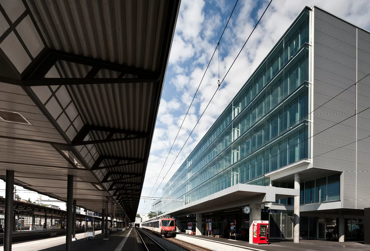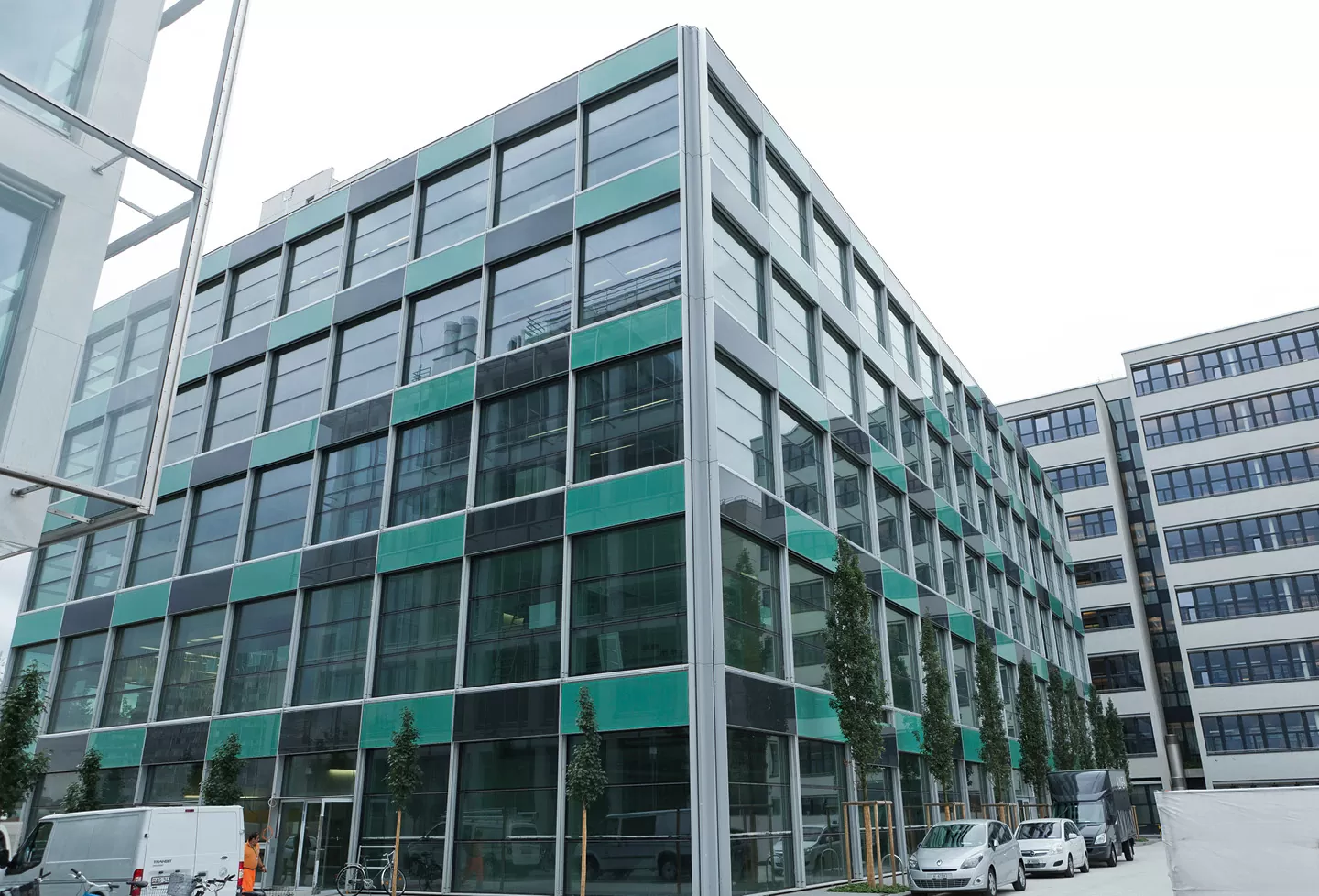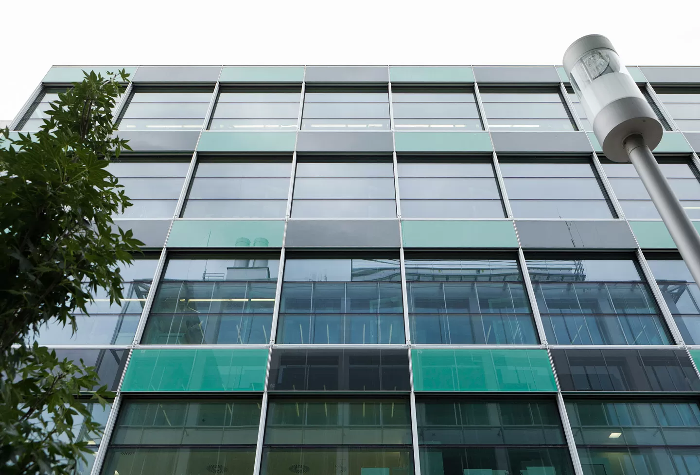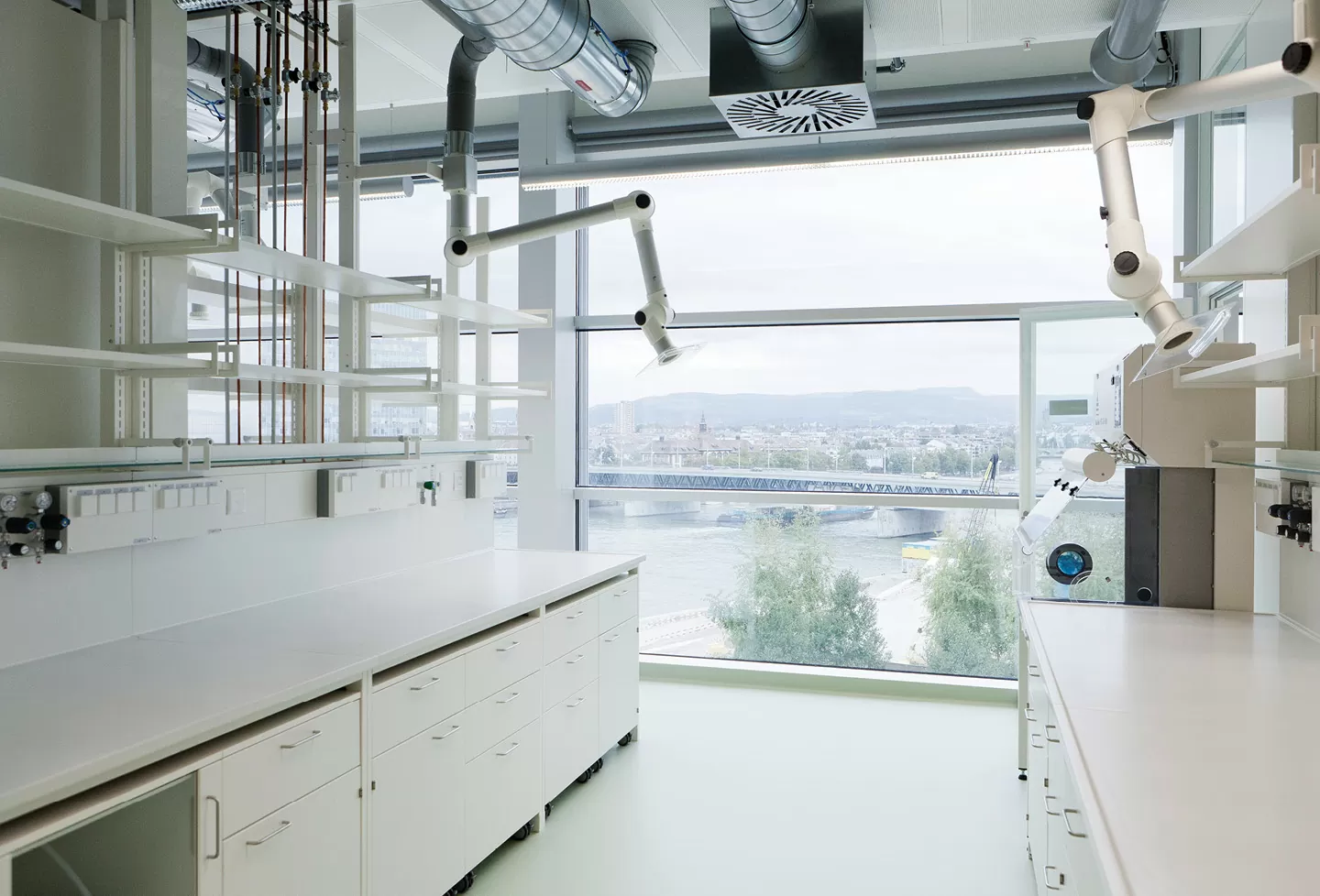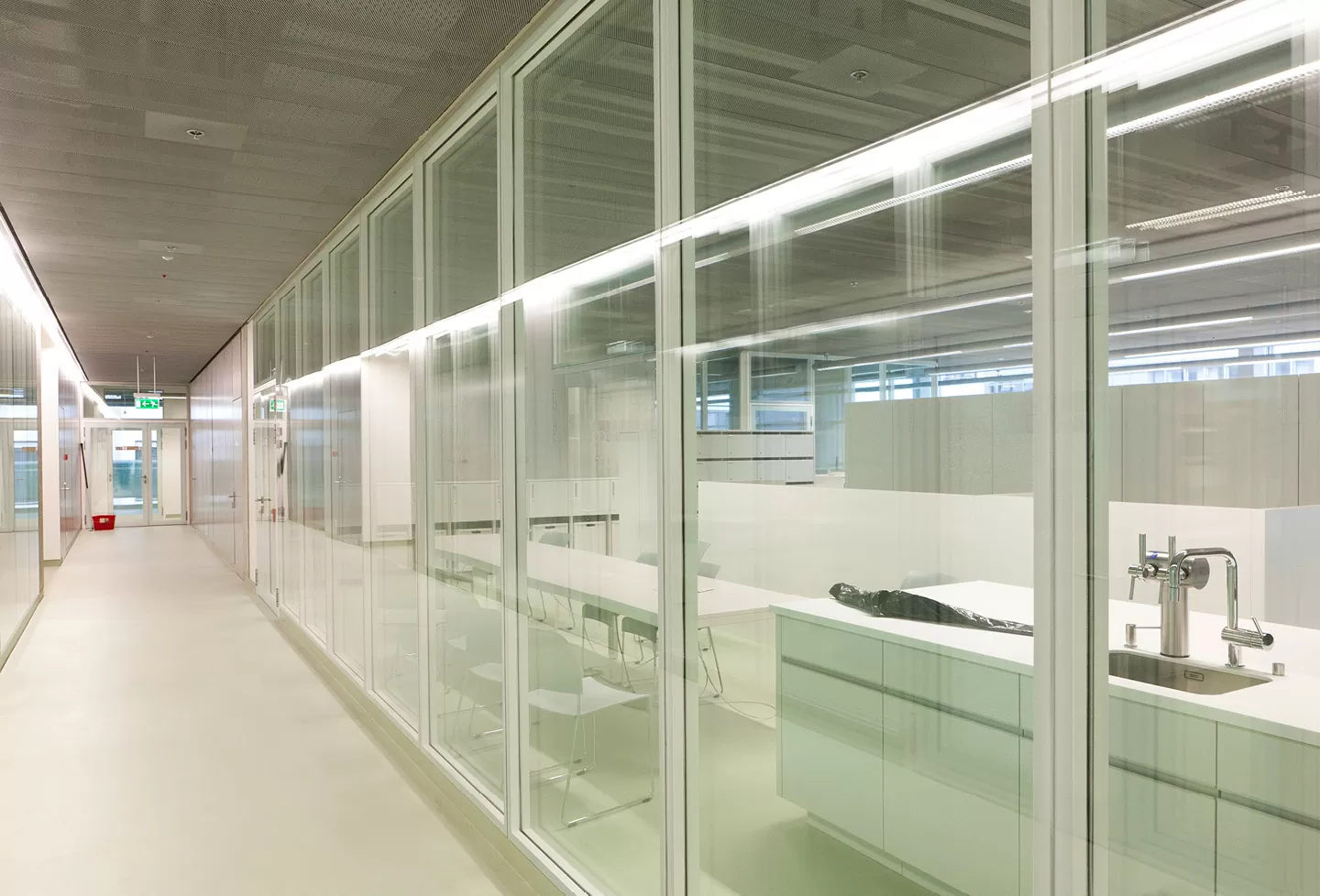 Das Volumen des kubischen, gleichmässig transparenten Laborgebäudes wird in 2 Untergeschosse, 5 oberirdische Geschosse und ein Dachgeschoss aufgegliedert. Den äusseren Abschluss des Gebäudevolumens bildet eine transparente Glashülle aus Isolierglas mit hohen Sonnenschutzeigenschaften und tiefem g-Wert. Vertikal verschiebbare, in Alu-Profilen gefasste Glastafeln dienen als variabler Sonnenschutz.