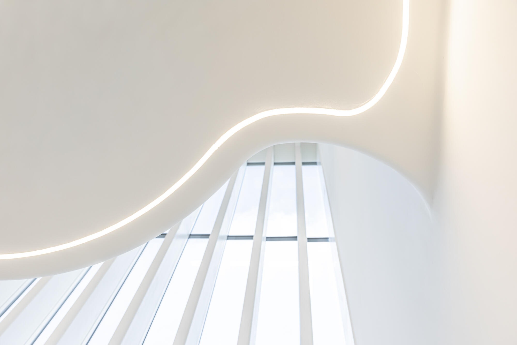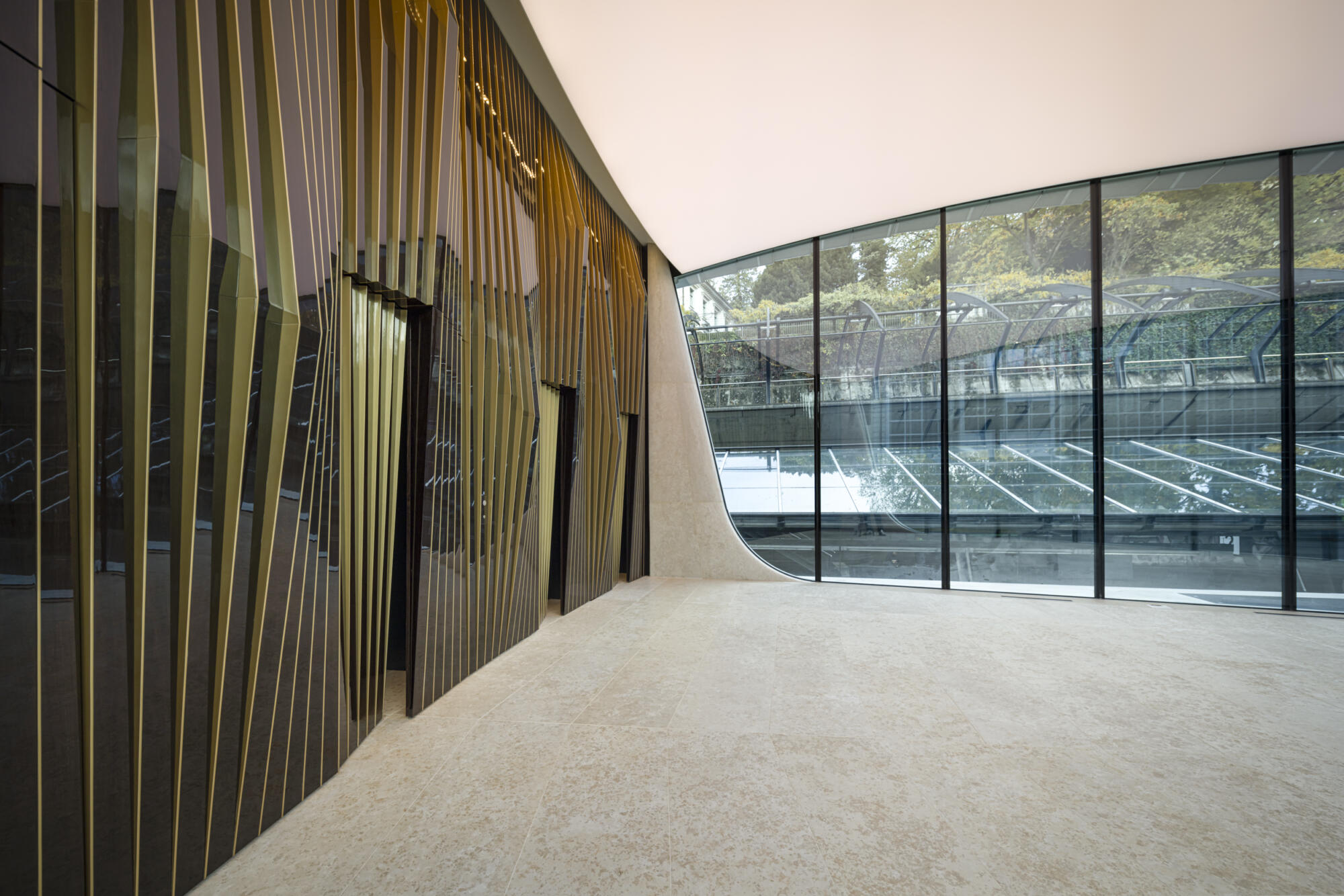 Der Dachrand bildet eine durchgehende horizontale Linie, während die Fassade zum Boden hin in einer dynamischen Bogenform abschliesst. Besonders im Bereich der Zugänge schaffen die hohen Bögen Raum für Personenverkehr und Tageslichteinfall. Im zurückversetzten Erdgeschoss bildet eine Rundbogenverglasung den unteren Abschluss der Fassade, die zu den stirnseitigen Eingängen ausgerichtet ist und eine Höhe von 4,60 Metern erreicht.