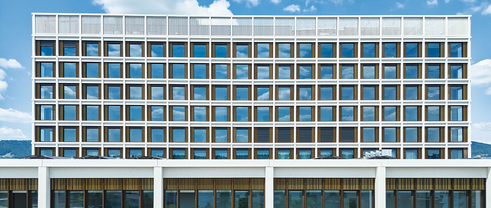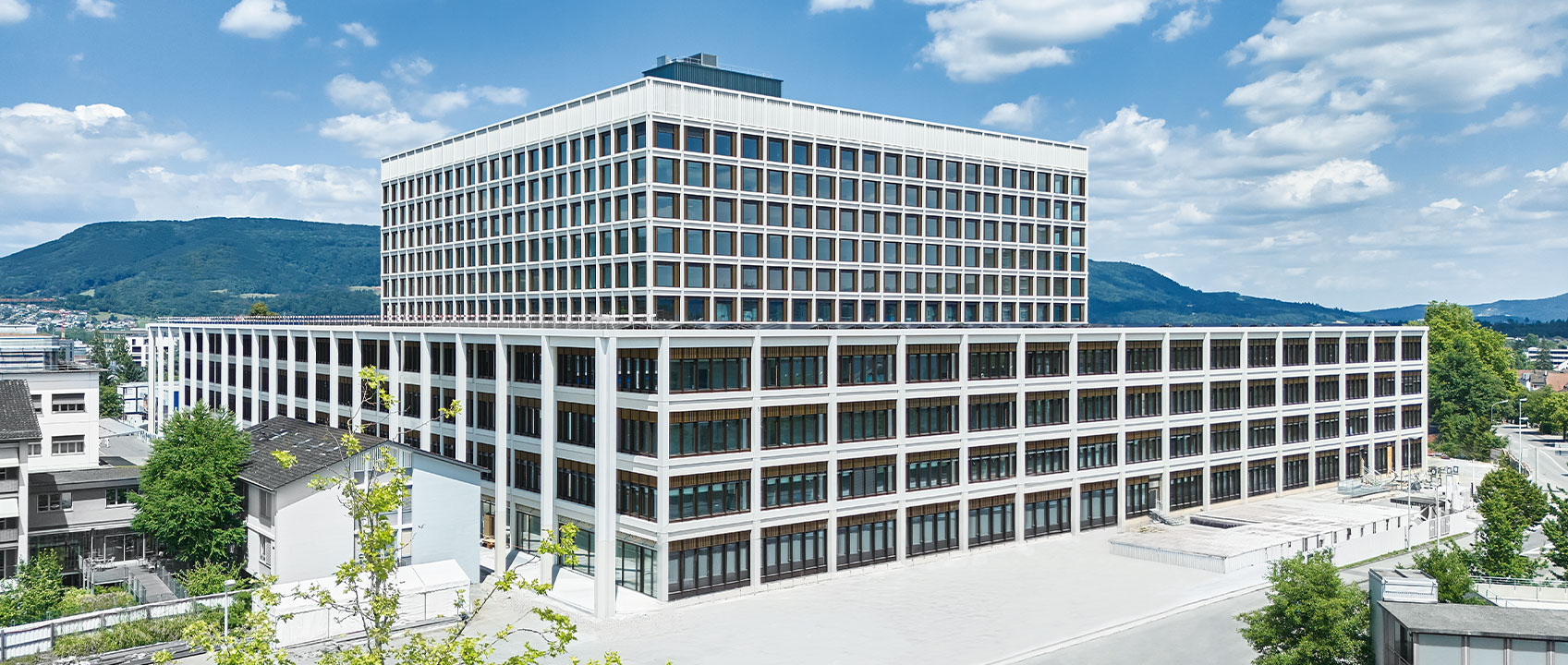 Die architektonische Haltung ist geprägt von Klarheit und Präzision. Insbesondere die sorgfältig detaillierten Fassaden im Bereich der Sockelgeschosse vermitteln Kompetenz und Sicherheit. Der Neubau basiert auf einem stringenten statischen Konzept mit einem gleichmässigen Stütz- und Ausbauraster. Dieses wurde bereits in der Entwurfsphase auf maximale Nutzungsflexibilität und langfristige Anpassbarkeit ausgelegt, sowohl funktional als auch baulich.