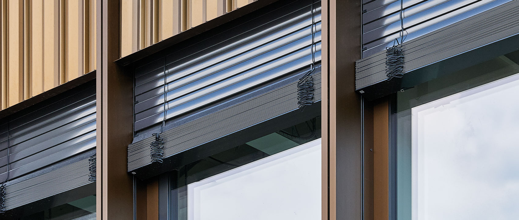 Die Farbgestaltung der Fassadenverkleidungen wurde sorgfältig differenziert: Während die Aussenfassade in einem bräunlich-goldenen Sandalor-Farbton (E6 I S120-2) gehalten sind, erhielten die Fassadenflächen in den Innenhöfen eine in Bronze eloxierte Oberfläche (E6). Die gewählte Oberflächenbehandlung vereint hohe Witterungsbeständigkeit mit einer hochwertigen Anmutung.