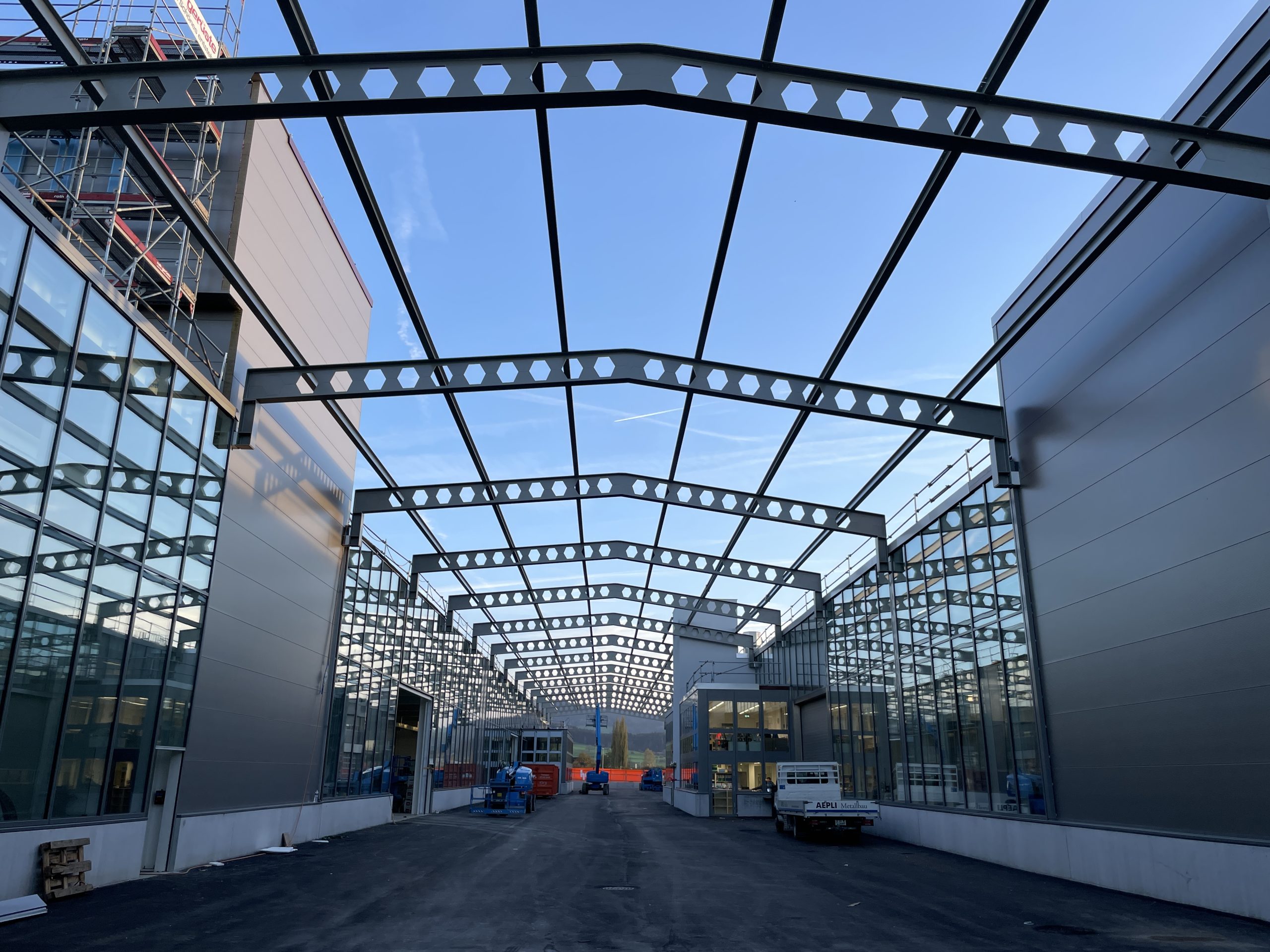 Auf der Baustelle geht es bei strahlendem Sonnenschein vorwärts. Die Aepli Stahlbau AG hat in den letzten Tagen die ersten Stützen und Dachträger der Stahlkonstruktion für die Halle B montiert.
